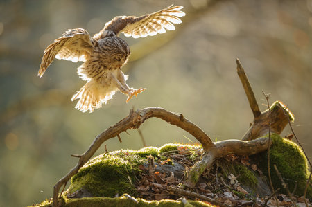 Owl Landing on Mossy Branch in Sunlit Forest