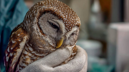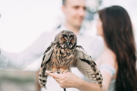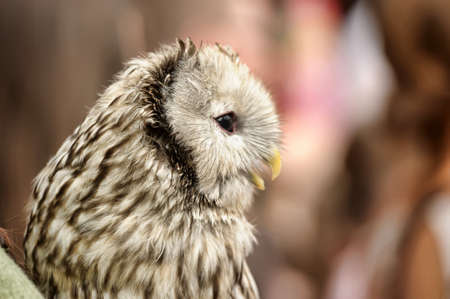 A portrait of a tamed owl's baby on the arm