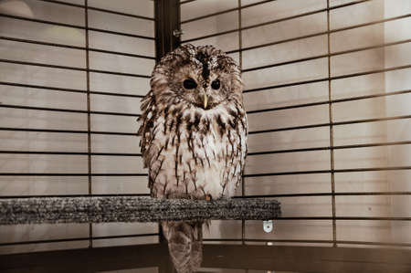 An owl, looking at the camera, sits in an enclosure at the zoo. Night bird of prey close-up. A wild animal. Close-up. A forest bird on a private eco-farm.