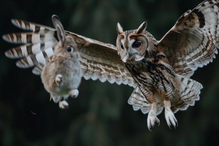 Two owls in flight, soaring through the air with wings outstretched, An owl silently swooping down on an unsuspecting rabbit, AI Generated