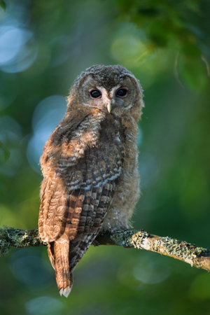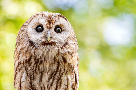 Tawny owl on a background of blurry summer greenery. Cute baby owl. Copy space. Concepts of wisdom, funny cute pet, amulet, summer time, vacation, circadian rhythms, vision, biological illustration.