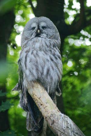 Great grey owl, Strix nebulosa, bird hunting in the forest. Owl sitting on old tree branch with forest in background