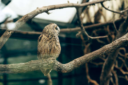 Long-eared owl Asio otus resting on the branch in Zoo Park. Sharp photograph with shallow depth of field.