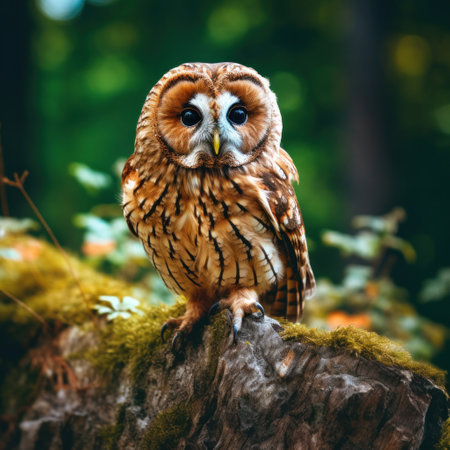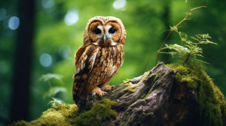 A tawny owl perched on stone in nature forest.