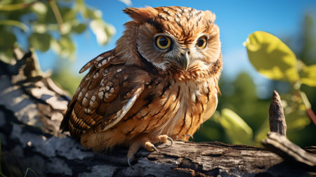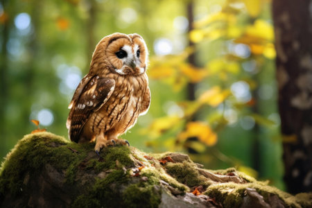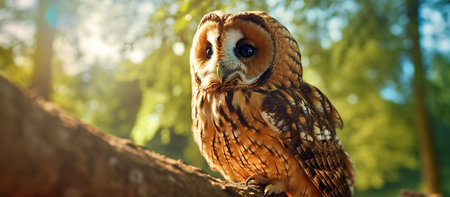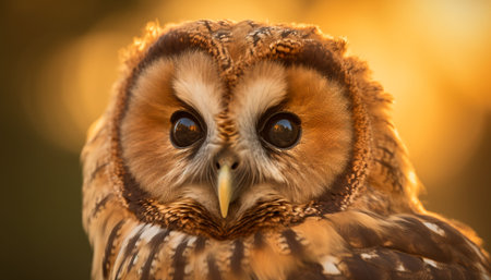 A portrait of a tawny owl illuminated by golden sunlight. AI-generated.
