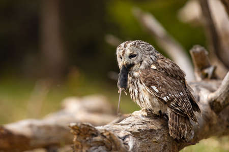 Tawny owl in the forest with mouse in the beak. Brown owl (Strix aluco) sitting on tree in the forest habitat with catch. Beautiful bird in the forest.