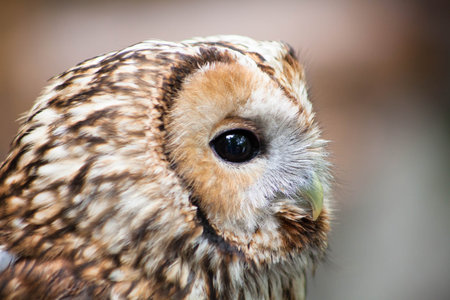 Very close profile portrait of a tawny brown owl looking to the right