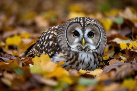 Little owl (Strix nebulosa) in the autumn forest