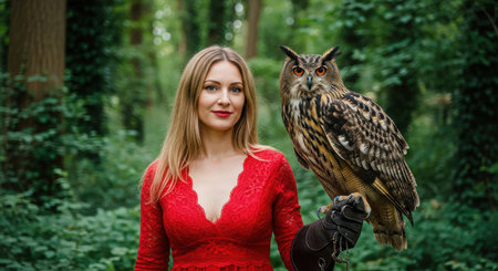 Beautiful young woman in red dress with an owl in the forest