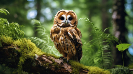 A brown owl perched on a mossy branch in a serene forest.