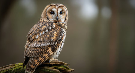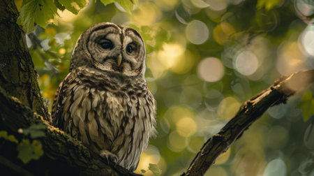 Ural owl resting on a tree branch in mixed forest. Known for its silent flight and deep hooting call, this large owl inhabits European and Asian woodlands.