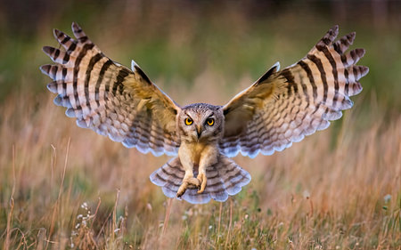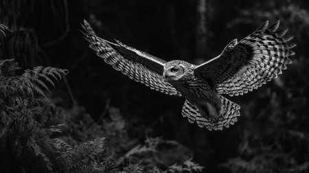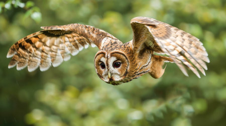 An owl glides silently through the trees at dusk, showcasing its striking feathers