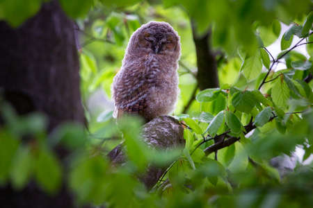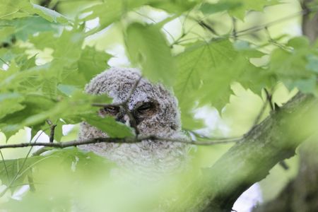 A young tawny owl (Strix aluco) hidden in green leaves of a tree.