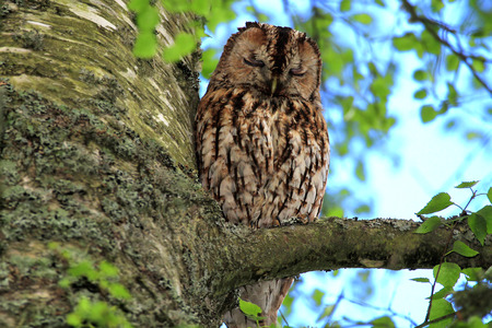 Tawny Owl Strix aluco asleep on a tree branch Wild bird not captive Taken in Angus, Scotland