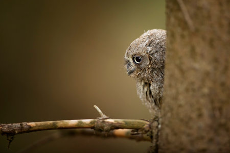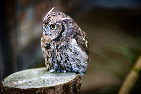 Eurasian scops owl (Otus scops) - Small scops owl on a branch in autumnal forest, its natural habitat