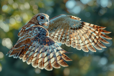A close-up image showcases an owl perched on a branch, displaying intricate feather patterns in shades of brown and white. The composition features soft, diffused lighting and a blurred background. This photograph could be utilized in various commercial projects, including educational materials and nature-themed designs.