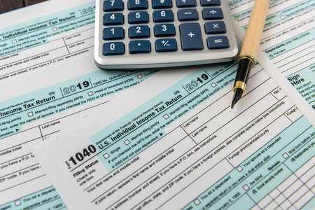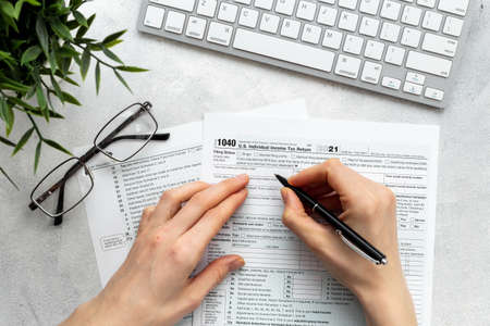 Hands filling US tax form. Culculating and payment of taxes concept