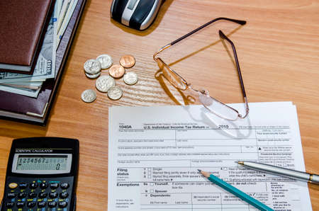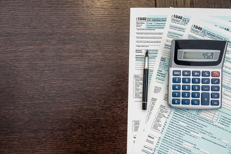 Tax day. 1040 form and calculator on table ready to be filled and returned.