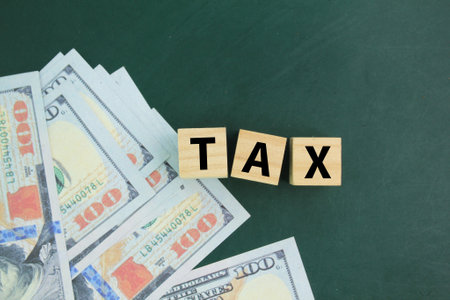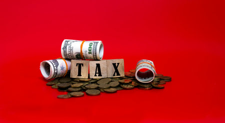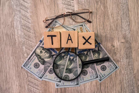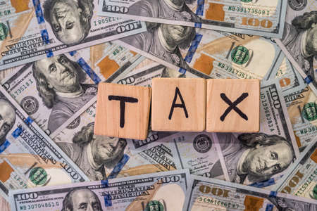 Wooden cubes with word 'tax' on american dollars