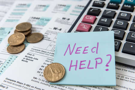 Finance tax form with calculator, laptop and pen. Sticker need help. Accounting time