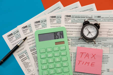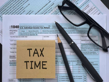 Tax-filling concept - ‘Tax time’ written on a paper, a pencil, a pen, eyeglasses, featuring half of U.S IRS 1040 form.