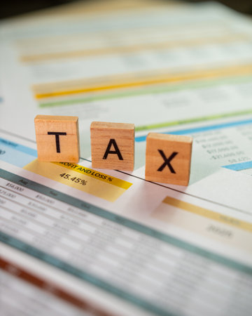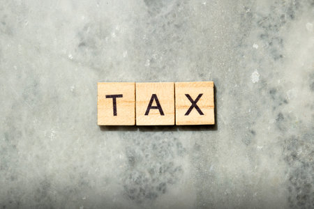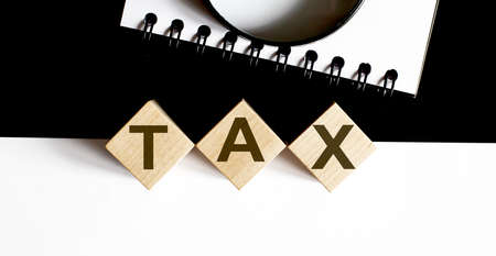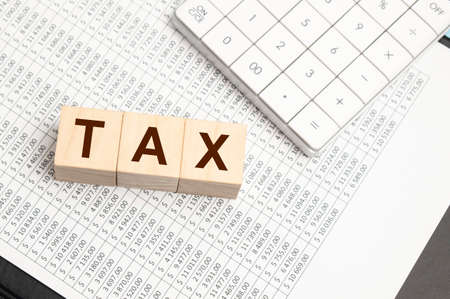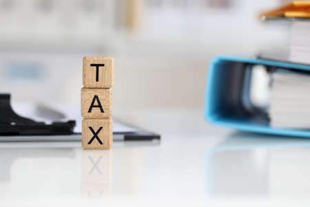 Tax text on wooden cubes on table with documents