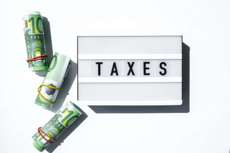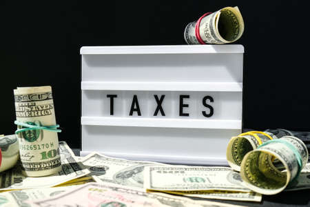 Lightbox board with word TAXES in black letters around Us dollars banknotes. Tax payment and filing concept. Money, Business, finance, investment, saving and corruption. Cash bill