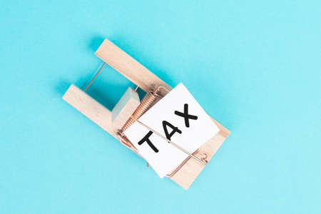 Paper with the word tax in a mousetrap, high financial burden, costs and expenses in business, taxation by the state