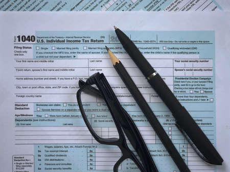 Tax-filling concept. A pencil, a pen, eyeglasses, featuring half of U.S IRS 1040 form.