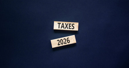 Taxes 2026 new year symbol. Concept words Taxes 2026 on beautiful wooden blocks. Beautiful black paper background. Business and taxes 2026 new year concept. Copy space.