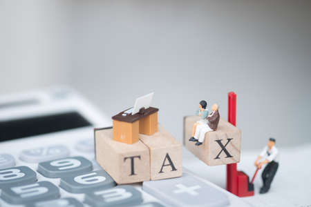 Miniature people businessman sit on wood word TAX placed on calculator. Pay annual income (TAX) for the year. using as background business concept and finance concept