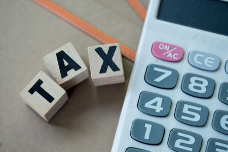 Small wooden stamp with alphabet combine the word TAX and calculator, individual income tax pay yearly.