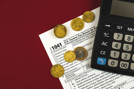 Tax form 1041 background with calculator and cash, money, business tax day concept, copy space photo