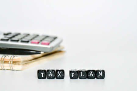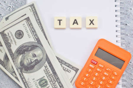 Debt collection and tax season concept. The word tax written in wooden block letters with calculator, money, pen, background, Time to pay concept