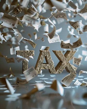 Piles of cash surround a bright yellow tax document, representing the complexities of managing finances during tax season in a modern context.