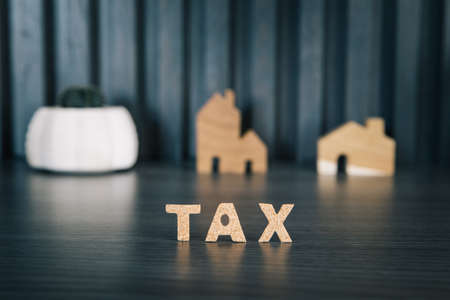 TAX word with wooden home model and cactus on background, tax concept
