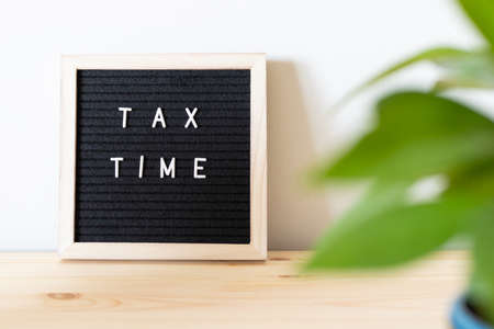 Tax time black felt letter board and flower pot on the table. Business tax return concept.