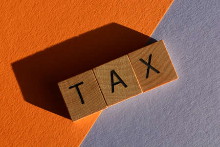 Tax, word in 3D wooden alphabet letters with copy space