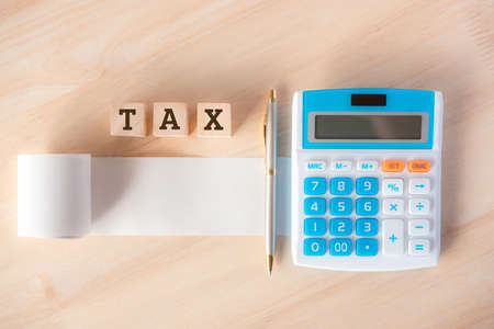 calculator and bill with wood cube text tax