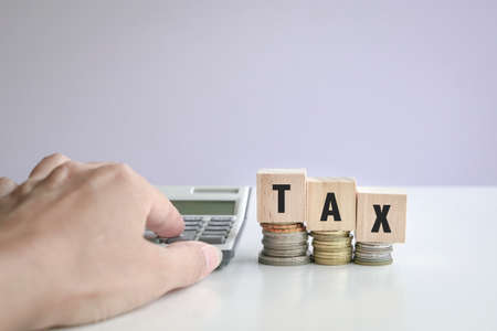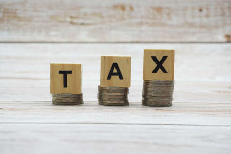 Tax Concept with wooden block with stacked coins