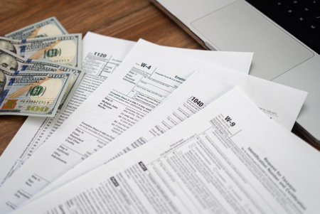 Tax forms and dollar bills on a wooden desk with a laptop. Financial management, tax refund, and accounting concept.