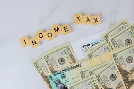IRS form 1040 with individual income tax return of dollar bills, accountant is calculating company of Stimulus economic tax return check