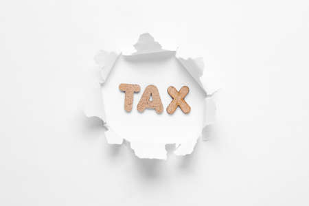 Word tax in a torn hole on white background. Minimalism economy concept. Top view