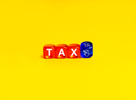 Taxation, Interest rate, tax refund, financial concept. Text TAX arrange on red dices and up and down arrow percentage sign on flipping blue dice, isolated on yellow background, minimalist.