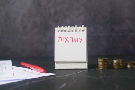 Page of diary or agenda, with the text today ... tax day, and money next to it. Deadlines and tax obligations. Tax increase.