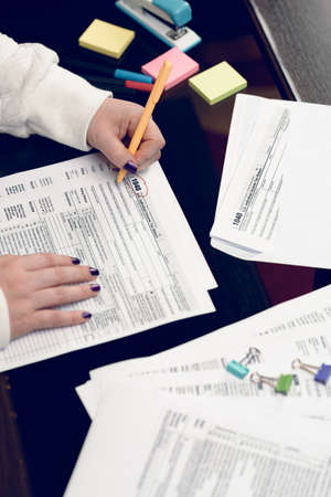 Woman fills the tax form, working with tax documents. Form 1040 Individual Income Tax return form. United States Tax forms. American blank tax forms. Tax time.