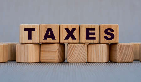 TAXES - word on wooden cubes on a beautiful gray background. Business concept
