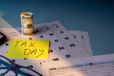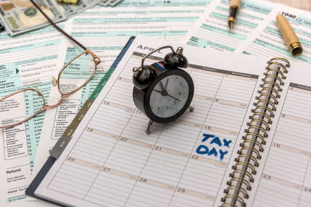 Tax day marked on calendar, calculator and tax form on desk