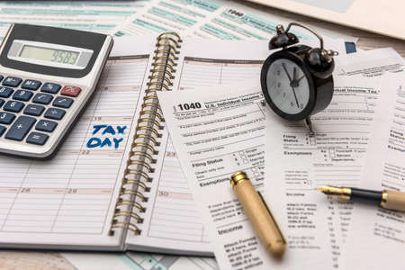 Tax day. 1040 form and calculator on table ready to be filled and returned.