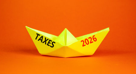 Taxes 2026 new year symbol. Concept words Taxes 2026 on beautiful yellow paper boat. Beautiful orange paper background. Business and taxes 2026 new year concept. Copy space.